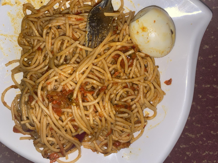 A white, irregularly shaped plate, positioned on a reddish-brown patterned surface, contains a portion of spaghetti coated in a reddish-orange sauce with visible chunks of tomato and possibly other ingredients. A silver-colored metal fork is partially embedded in the spaghetti, tines down, near the upper center. To the upper right, a peeled, hard-boiled egg with minor sauce residue is resting on the plate. No individuals are present in the scene, which is located in Mape, Nigeria.
