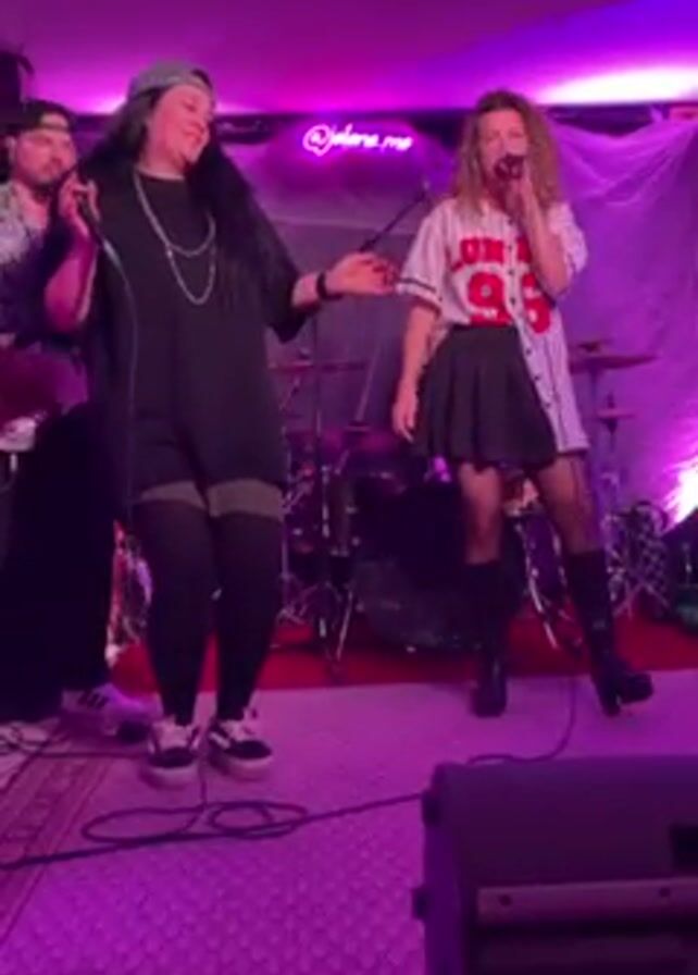Two female singers are performing on stage under purple lighting. One wears a gray baseball cap, black top, black leggings with light gray patches, a long silver necklace, and black-and-white sneakers. She's dancing and singing into a microphone. The other singer wears a baseball jersey with "LON 96" on it, a black skirt, dark pantyhose, and black boots. She also sings into a microphone. Behind them is a drummer and what appears to be a guitarist standing off to the side. The stage has a red rug and a large black speaker stands in front. A neon sign above the stage reads "@jakarame."