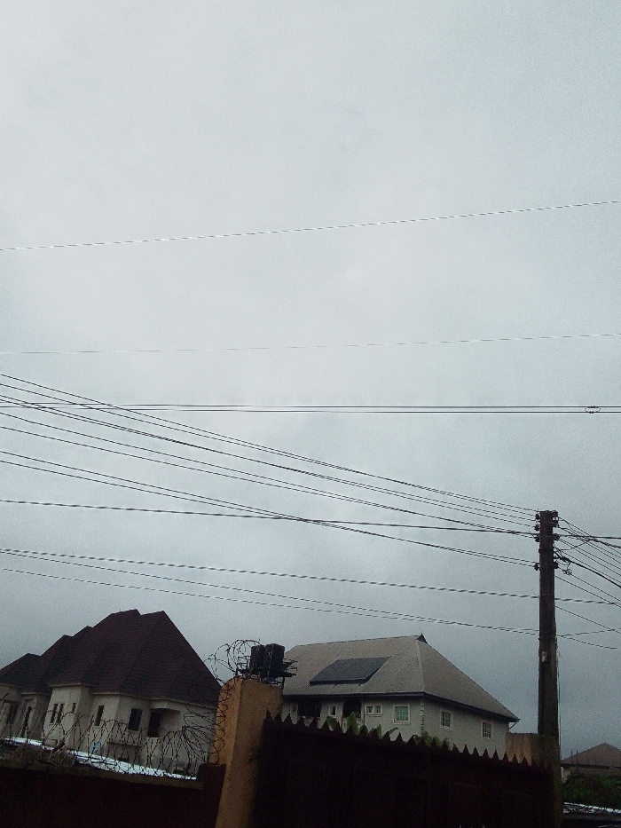 The scene, located in the city of Unknown, Unknown, depicts an urban or suburban residential area under an overcast, light grey sky. The lower portion of the image features a dark, possibly metal, fence or wall. A light-colored concrete pillar, topped with coiled barbed wire, is centrally positioned behind this barrier, with a dark water tank assembly visible directly behind the barbed wire. Beyond this foreground element, two multi-story residences are present. The house on the left exhibits a light-toned facade and a dark red-brown hipped roof. A white fence, also topped with barbed wire, runs partially in front of this residence. The house on the right features a light-toned facade and a light grey hipped roof, upon which a dark, rectangular solar panel array is installed. On the far right, a dark utility pole, equipped with multiple cross-arms and numerous bundled wires, stands prominently. A dense network of thin, dark utility lines, some appearing continuous and others segmented, traverses the sky across the mid-to-upper sections of the image. No individuals or discernible actions are present.