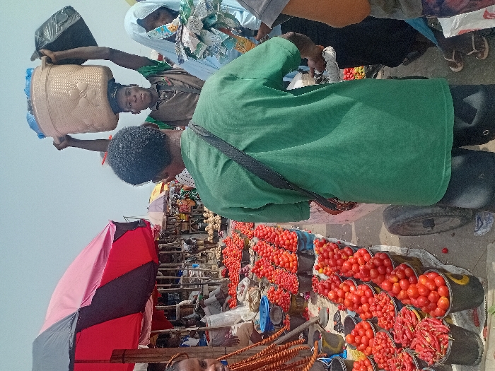The image depicts a bustling outdoor market scene in the city of Alasia, Nigeria, under a bright, clear sky. In the immediate foreground, facing away from the viewer, stands a person wearing a green short-sleeved shirt and dark shorts or trousers, with a dark strap crossing their back. To their left, an extensive display of red produce is arranged on the ground. This includes multiple black and blue buckets filled with plump red tomatoes and smaller piles of red chili peppers, all neatly stacked. A single dark wheel, likely from a cart, is partially visible to the right of the person in green. Fragments of other individuals' lower bodies, including feet in flip-flops and a white plastic bag, are visible at the bottom right. In the midground, a person with dark skin, wearing a brown vest-like garment over a green-sleeved shirt, carries a large, light-brown woven basket balanced on their head with both arms raised to support it. A black plastic bag is also held aloft in their left hand. To the right of this person, a woman partially obscured, wears a light blue head covering and appears to be observing something. A decorative object, possibly fashioned from folded currency, is visible on her person. Further into the midground and background, the market continues with numerous stalls, some featuring red and black striped umbrellas or tarps providing shade. More individuals are visible throughout the market, engaged in various activities. The ground appears to be a dirt or unpaved surface. The overall impression is one of active commerce and abundant produce.