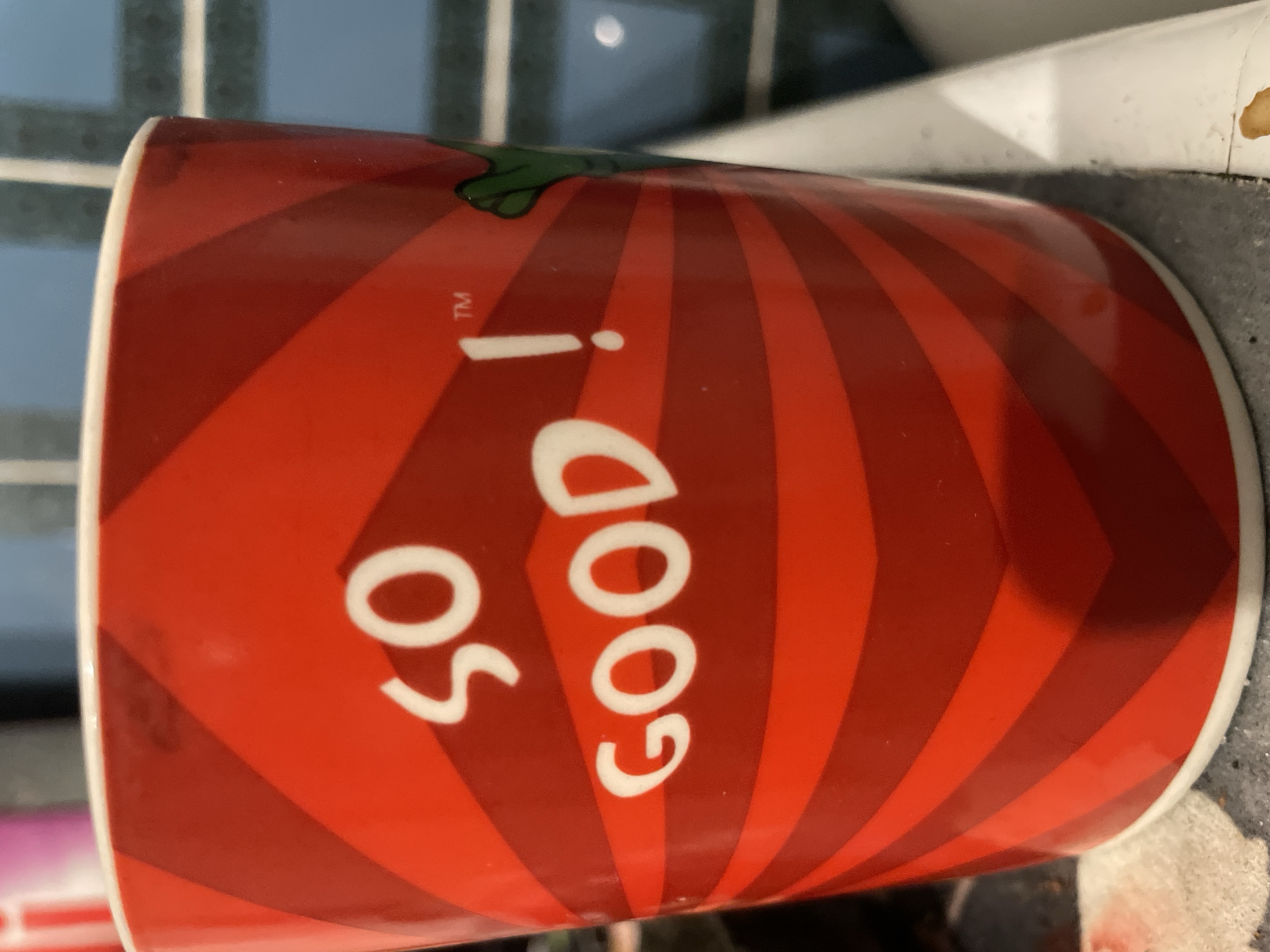 A close-up photograph captures a cylindrical mug, positioned on a speckled gray countertop in what appears to be a kitchen or utility area within Senden, Germany. The mug is predominantly red with a repeating pattern of alternating bright red and darker red diagonal stripes, forming a chevron-like design around its circumference. Prominently displayed on the front of the mug in white, stylized capital letters is the phrase "SO GOOD!", with a small superscript "™" symbol located above and to the right of the exclamation point. A partial green, cartoon-like appendage, possibly a hand or tentacle, is visible emerging from the right side of the mug's design. The mug has a white rim at its top and bottom. The background features light blue rectangular wall tiles with white grout lines. A white vertical surface, possibly the edge of a sink or appliance, is visible to the right of the mug. A dark, irregularly shaped stain is present on the countertop surface to the lower right, near the base of the white vertical surface. No people are visible, and no explicit actions or interactions are depicted.