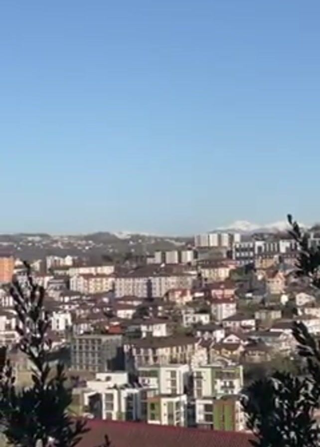 daytime panoramic view of a dense urban landscape under a clear blue sky. The foreground includes some tree branches and foliage on the right. The mid-ground is dominated by a variety of buildings, mostly multi-story residential structures. They appear to be arranged in a relatively compact layout with a mix of architectural styles. Colors vary, including some with light tan or beige facades, and others with dark brown or orange roofs. In the background, a row of mountains is faintly visible on the horizon, with snow-capped peaks.