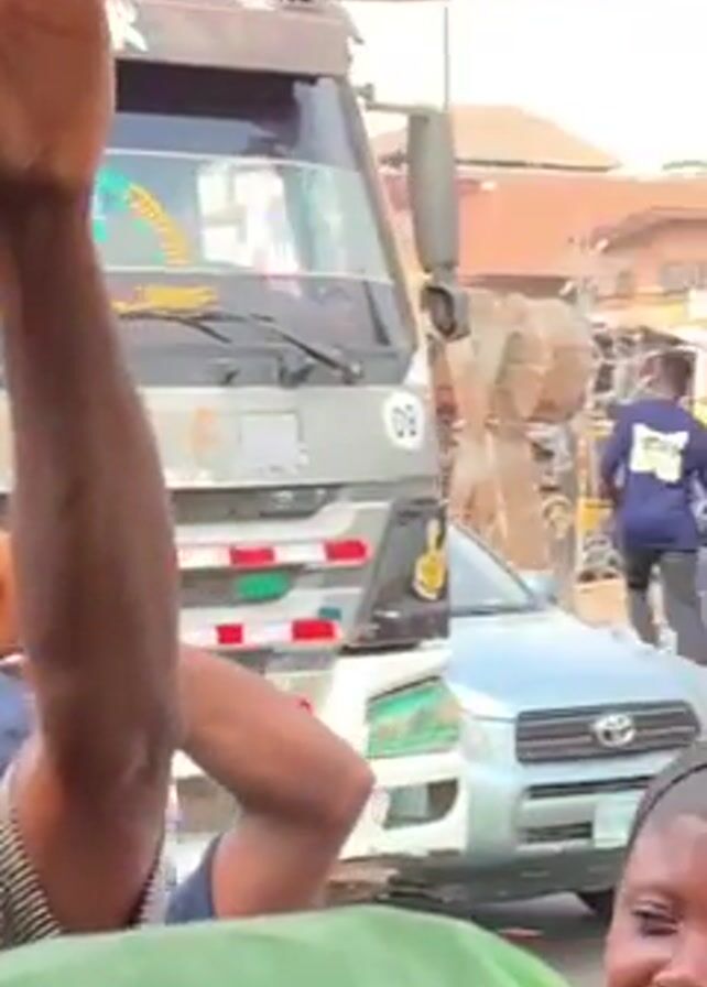 From inside a vehicle, the video pans across a busy street in what appears to be a market. People walk around, some under umbrellas, while others are sitting or standing near stalls. There's a large truck with writing on the front in the frame, as well as smaller cars and a traffic light. The atmosphere seems crowded and bustling.
