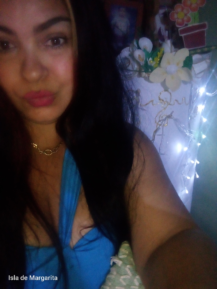 A woman with long, dark hair and a gold chain necklace poses in a blue top. She has light skin, full lips, and is positioned on the left side of the frame. In the background, a blurred arrangement of white and yellow artificial flowers decorates a surface illuminated by string lights. A framed picture is also faintly visible in the background. The words "Isla de Margarita" are at the bottom left of the image.
