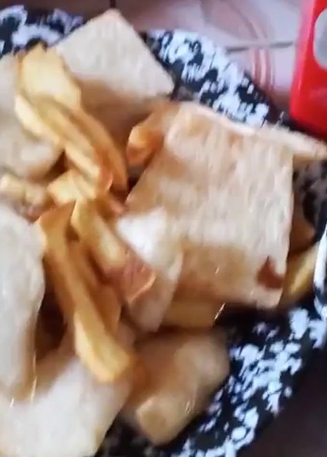 A close-up, top-down shot shows two plates of food and a red carton of milk on a tiled surface. The plate on the left contains a mix of thick-cut fries and square-shaped fried dough. The plate on the right holds a pile of scrambled eggs with visible seasonings. The red carton of milk, labeled "Journey," features an image of a cow and various milk products. The plates are black and white with a speckled, almost cow-print, design. The tiled surface has a light orange and brown pattern. The camera remains static throughout the shot.