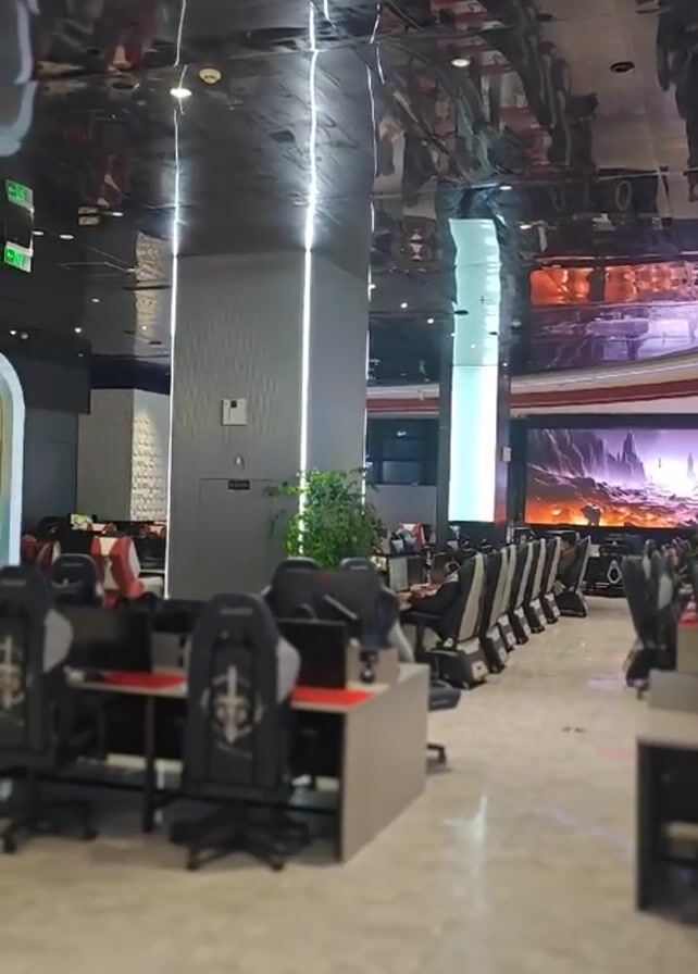 The camera pans across an indoor gaming center. The room has a shiny, reflective ceiling. Rows of black gaming chairs with a white logo on the back face the center. Each chair is situated at a desk with a computer. Several people are seated at the computers, appearing to be gaming. There are large screens displaying images of fantasy landscapes and characters. Potted plants are placed throughout the room. The floor is light-colored and polished. The lighting is bright, with a mix of natural and artificial sources.