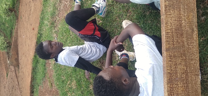 Two people are sitting on the grass outside. One person wears a grey t-shirt with long black sleeves, black leggings, and black and red shorts. The other person is wearing a white t-shirt. A wooden plank is placed next to them. The grass is green and is right next to a dirt road.