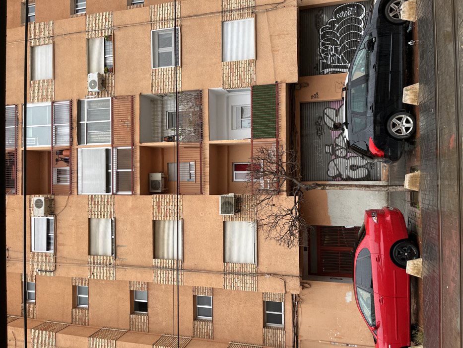 A tall, peach-colored building with rows of windows and open balconies is seen. Several air conditioning units are attached to the exterior. Graffiti-covered metal shutters are on the side of the building. A bare tree is in front of the building. A black car is parked on the street against concrete blocks. A red car is parked behind it on the street. Street rails are running along the street.
