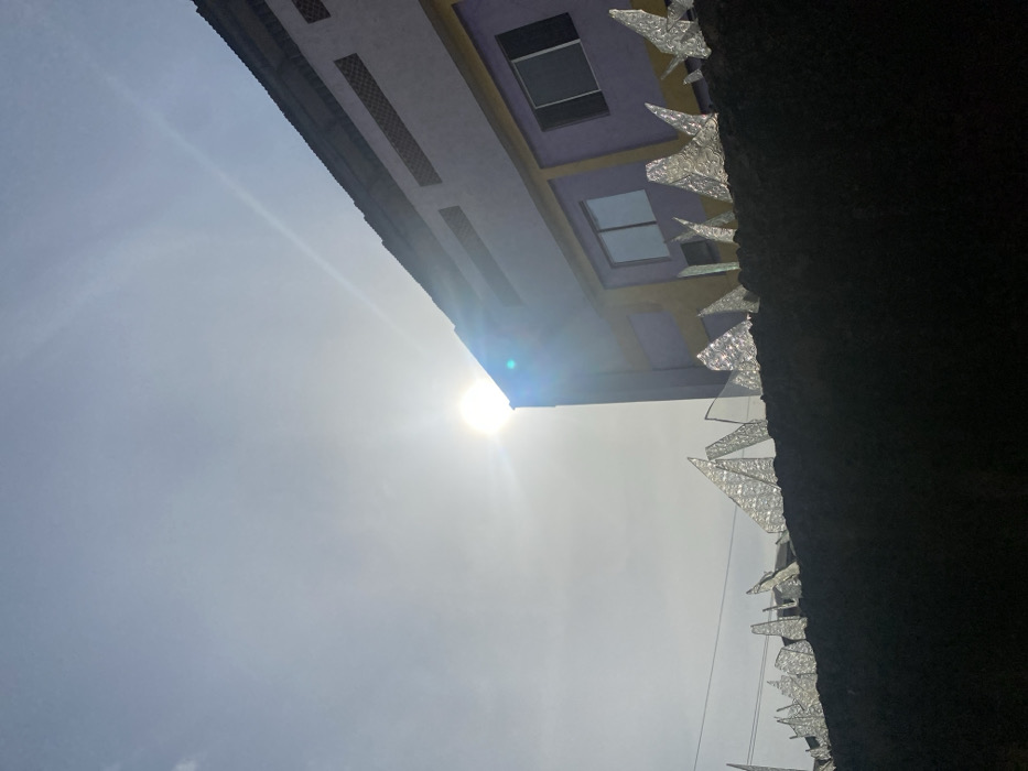 An exterior scene in Alagba, Nigeria, is depicted under direct sunlight. The sun, located in the upper-left quadrant, generates significant lens flare and illuminates the environment. A multi-story building occupies the right half of the frame, featuring sections painted light purple/lavender and yellow. Visible architectural details include rectangular windows on the lower purple section and horizontal ventilation slits on the upper level, topped by a dark, corrugated roofline. In the foreground, a dark-toned perimeter wall runs horizontally across the lower portion of the image. Embedded vertically along the top edge of this wall are numerous sharp, irregularly shaped shards of clear or frosted glass, reflecting sunlight and functioning as a security measure. No individuals, vehicles, or dynamic actions are present.