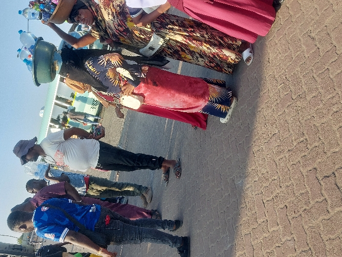 This image depicts an outdoor scene at what appears to be a transportation hub, consistent with the Dar es-Salaam ferry terminal in Tanzania