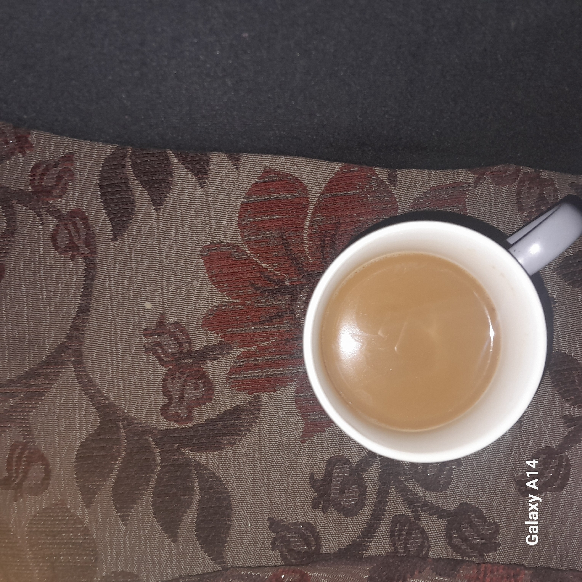 white mug filled with a light brown liquid, possibly tea or coffee with milk, placed on a patterned fabric surface. The fabric has a dark background with a floral pattern in shades of red and brown. The mug has a light grey handle. A dark, undefined area, possibly a piece of furniture or clothing, is visible in the upper left corner of the image. The text "Galaxy A14" is written in white along the right edge. The photograph provides no indication of being taken in Khan Yunis or any other specific location. There are no people visible in the image. The focus is on the mug and the surface it rests upon.