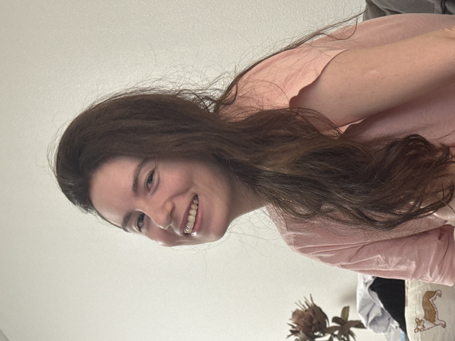 A young woman with long, wavy brown hair smiles broadly, revealing her teeth