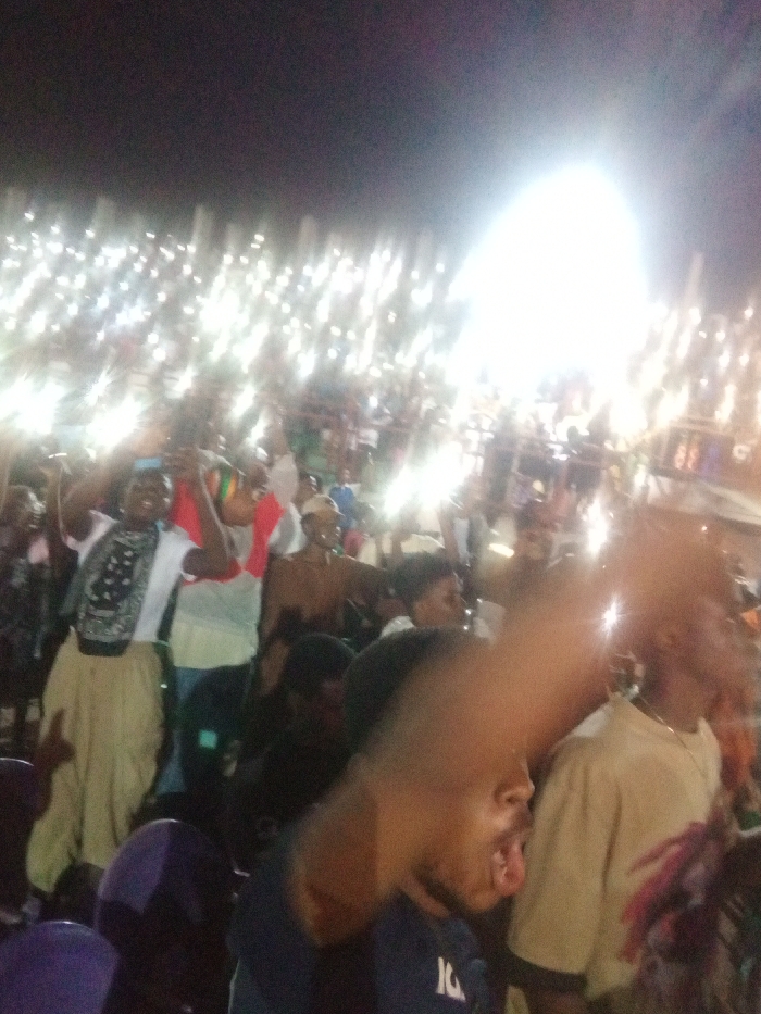 The image depicts a dense outdoor nighttime gathering in Nsukka, Nigeria, characterized by a large crowd of individuals