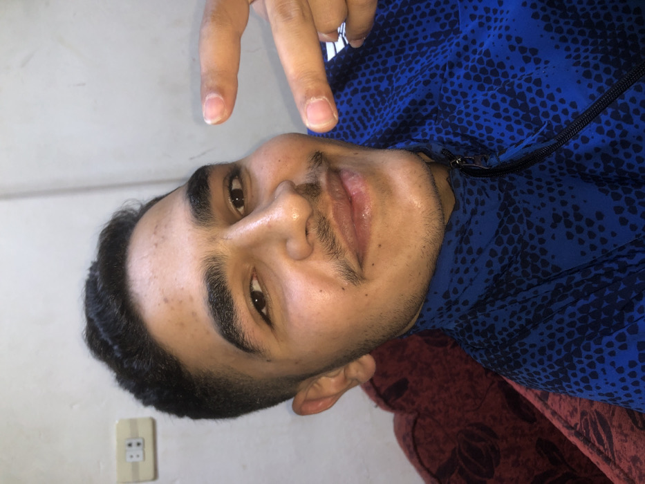 A young male, appearing to be in his late teens or early twenties, is depicted in a close-up, slightly upward-angled portrait. The individual has short, dark, wavy hair, thick dark eyebrows, dark eyes, a prominent nose, and a thin mustache. He exhibits a light skin tone and a closed-mouth smile. He is wearing a royal blue long-sleeved top patterned with irregular black speckles, featuring a partially unzipped black zipper down the front. His right hand is raised to the right of his face, with the index and middle fingers extended upwards in a 'V' shape. The background consists of a plain, light-colored wall. An off-white electrical outlet with two horizontal rectangular sockets is visible on the upper left section of the wall. A portion of a reddish-brown upholstered furnishing is present on the left side, behind the subject's left shoulder. This scene is located in At-Tall, Syria.