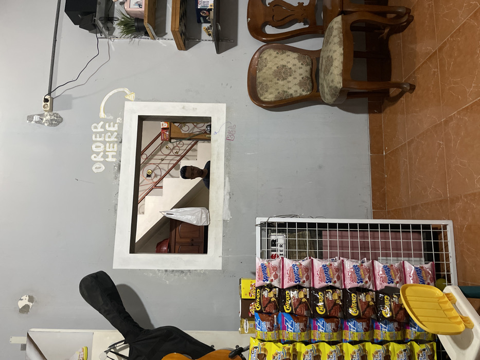The image depicts an indoor scene in Margorejo, Indonesia, characterized by a grey, textured wall and reddish-brown tiled floor. In the center, a white-framed rectangular opening functions as a service window. Through this opening, a young man with dark hair and a dark shirt is visible from the chest up, looking directly forward. Behind him, white stairs with an ornate reddish-brown iron railing ascend. To the left of the man, inside the opening, a dark wooden cabinet is partially visible, with a white plastic bag hanging nearby. To the right, on a surface, are several small packaged items. A small silver bell is positioned on the sill of the opening, beneath the packaged items. Above the opening, the words "ORDER HERE" are stenciled in white, block letters, accompanied by a curved white arrow pointing downwards and to the right. Below the opening, the letters "BEL" are written in pink. An exposed electrical outlet with wires extending to the right is visible on the upper right portion of the wall. To the far left, a black guitar case hangs from an unseen hook. Adjacent to this, and filling the lower left quadrant, is a white metal grid display rack abundantly stocked with packaged snack foods, including "Chitato," "Sponge Crunch," and "Lays" brands. A yellow plastic stool or chair is partially visible in front of this rack at the bottom left. To the right of the central opening, two wooden chairs are positioned against the wall. The left chair features an upholstered seat and backrest with a light patterned fabric. The right chair is bare wood with a carved backrest. Above these chairs, a wall-mounted shelf unit with two wooden shelves displays small decorative items, including a potted plant and a pink photo frame.