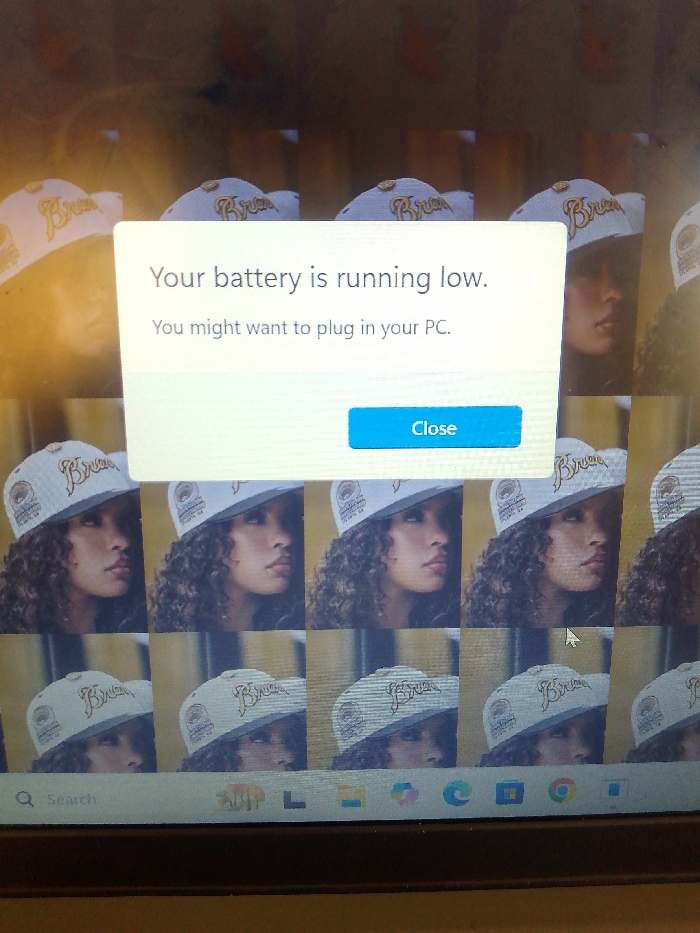 A laptop screen displays a notification: "Your battery is running low. You might want to plug in your PC." A blue 'Close' button appears below the message. The desktop background shows a repeating pattern of a woman wearing a baseball cap with the word "Braves" on it. Below the screen, the taskbar is visible with a search bar and various application icons.