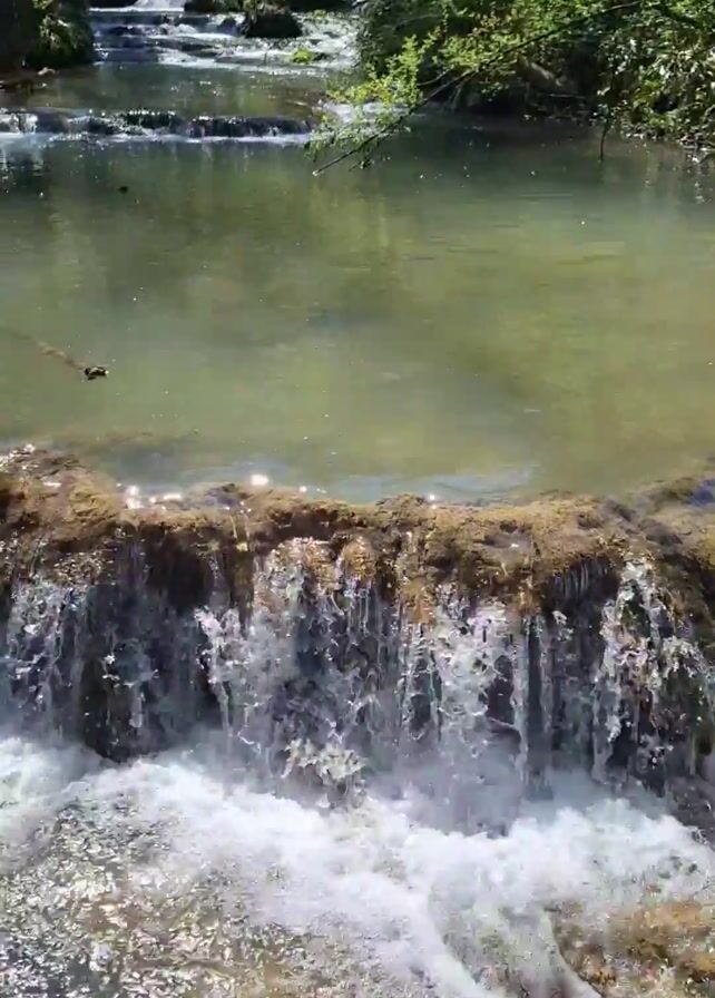 cascading waterfall in a verdant forest. The water appears clear and slightly tinted green, flowing over a natural rock formation. The sun reflects on the water's surface. The surrounding forest is lush with trees that have fresh green leaves. The perspective suggests the camera is relatively close to the waterfall.