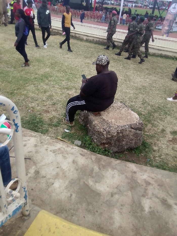 A person wearing a black shirt, black Adidas pants, and a hat sits on a large stone, looking at their phone. The person is outside on a grassy area, where several other people are walking. Some appear to be soldiers. A stadium is visible in the background. A concrete structure with chipped paint is in the foreground.