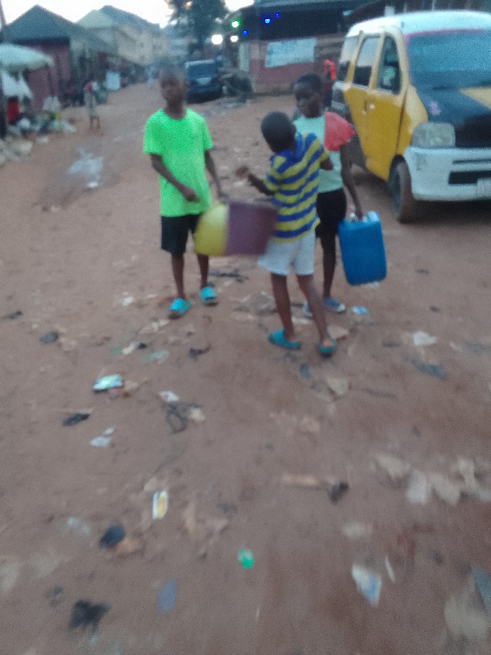 - "Three children stand on an unpaved, reddish-brown dirt road heavily littered with various debris in the city of Unknown, Unknown, during dusk or early morning" by FM-5Fe3Y2, licensed under CC BY 4.0