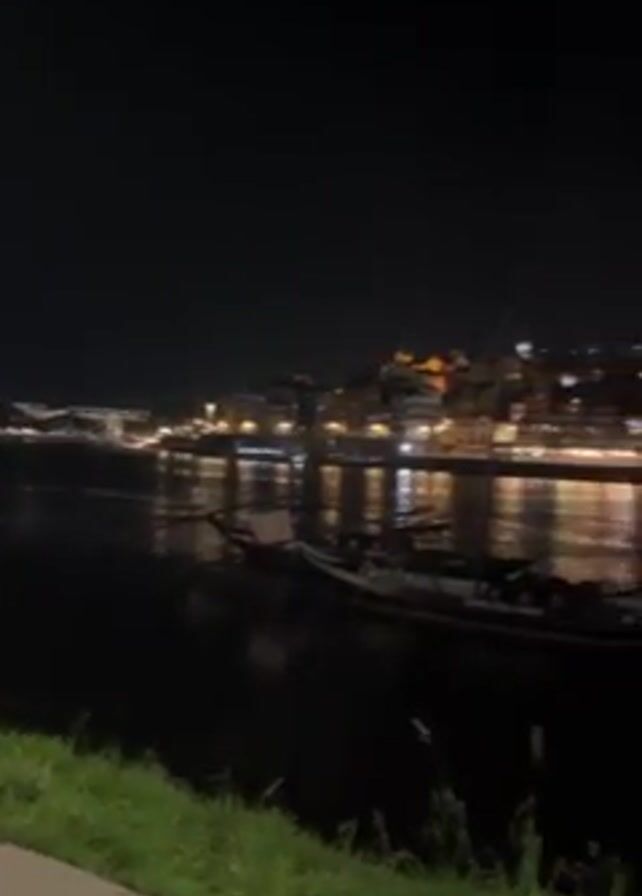 night view of a river in a city. The river is dark and reflects the lights from the buildings and bridge in the background. There are several small boats moored in the river. The bridge is illuminated and spans the river. The buildings are on a hill in the background and are also illuminated. There is a sidewalk with grass visible in the foreground. The sky is dark.