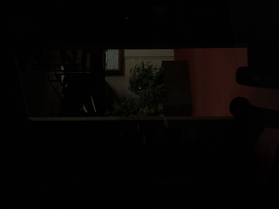 This image captures a dimly lit interior scene within the city of Bar, Montenegro. The perspective is from a shadowed foreground, where the dark silhouettes of two chair backs are faintly discernible at the lower center. The visible interior features a floor covered with a red carpet. Centrally positioned on the carpet is a dark, rectangular planter box containing several dense, leafy green plants. Behind the plants, a light-colored wall is visible. Affixed to this wall, above the plants, is a rectangular framed object, possibly a document or sign, with a dark frame. In the upper right portion of the frame, a dark spiral staircase with visible treads and railings ascends, suggesting a multi-level structure. The scene is illuminated by ambient interior light, resulting in moderate to deep shadows across all depicted subjects. No direct light sources are visible within the frame.