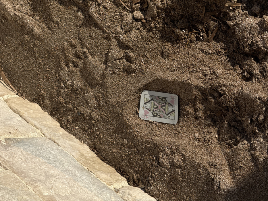 - "A single, worn playing card, specifically the Queen of Hearts, lies face-up and partially settled into loose, brown, fine-grained sand" by FM-7mF7g2, licensed under CC BY 4.0