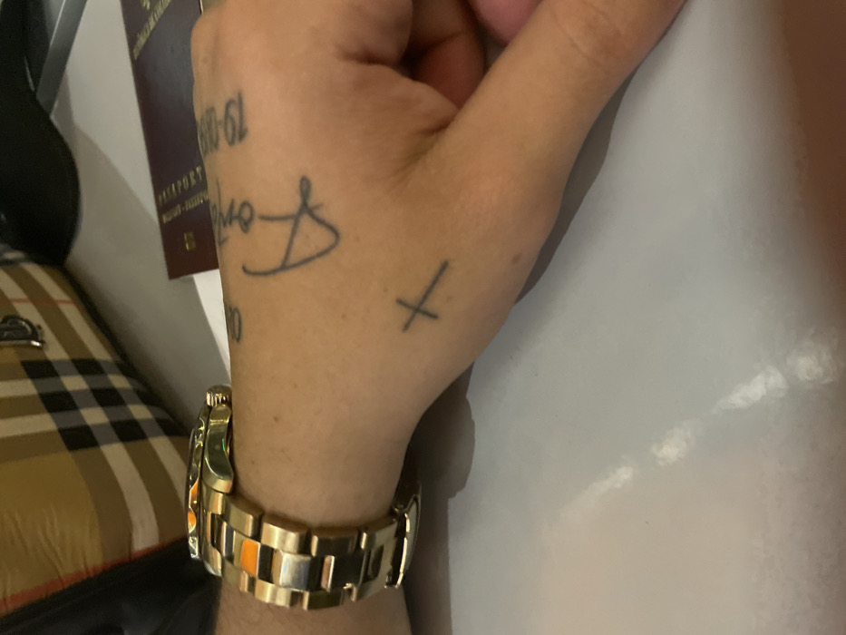 A hand rests on a white surface, adorned with a gold wristwatch and several tattoos. These include what appears to be a signature, the number "1962," and a simple cross. Next to the hand, partially visible, is a passport and a plaid bag. The overall setting is somewhat unclear, with the focus centered on the hand and its visible accessories.