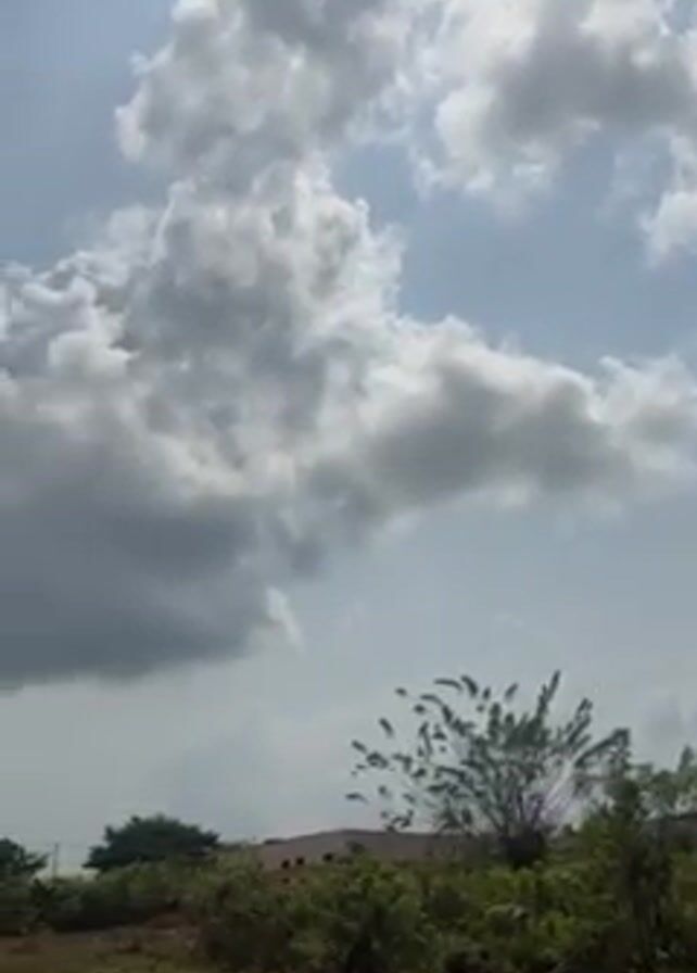 The camera pans upwards from a low-lying dirt track and some greenery, towards a sky filled with puffy white and gray clouds