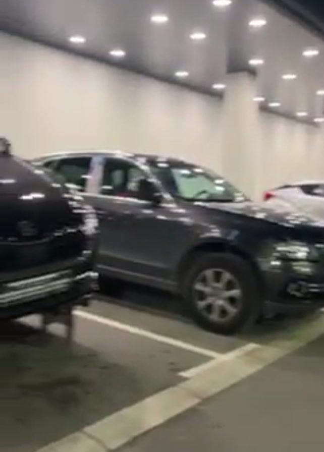 line of cars parked outside a building. The camera then pans to a black Skoda car, prominently displayed on a platform outside the entrance of a Kia dealership. The car is adorned with a large red bow, giving the impression of a gift. There are plants placed near the platform to enhance the display. The scene is illuminated by the building's bright exterior lighting.
