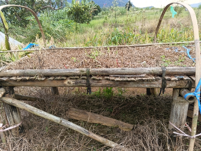The scene depicts an outdoor agricultural setup located in a rural or peri-urban area of Chengdu, China. A raised plant bed, constructed from weathered bamboo poles and wooden logs, occupies the central foreground. The bed, approximately 1.5 to 2 meters long, is supported by four vertical bamboo posts and secured with dark ropes and sections of blue and pink synthetic cord. The planting surface is covered with a uniform layer of light-brown organic mulch, from which numerous small green plant sprouts emerge. Two curved bamboo arches rise from either end of the planter; a light blue plastic bag or cloth is tied to the apex of the right arch. The ground beneath the raised bed is covered with dry, sparse vegetation, including dead grass and weeds, along with fallen bamboo fragments and a piece of weathered lumber. The background features dense green foliage, including trees and tall grasses, with faint outlines of distant hills or mountains visible against a bright, hazy sky. No individuals or active subjects are present in the image.