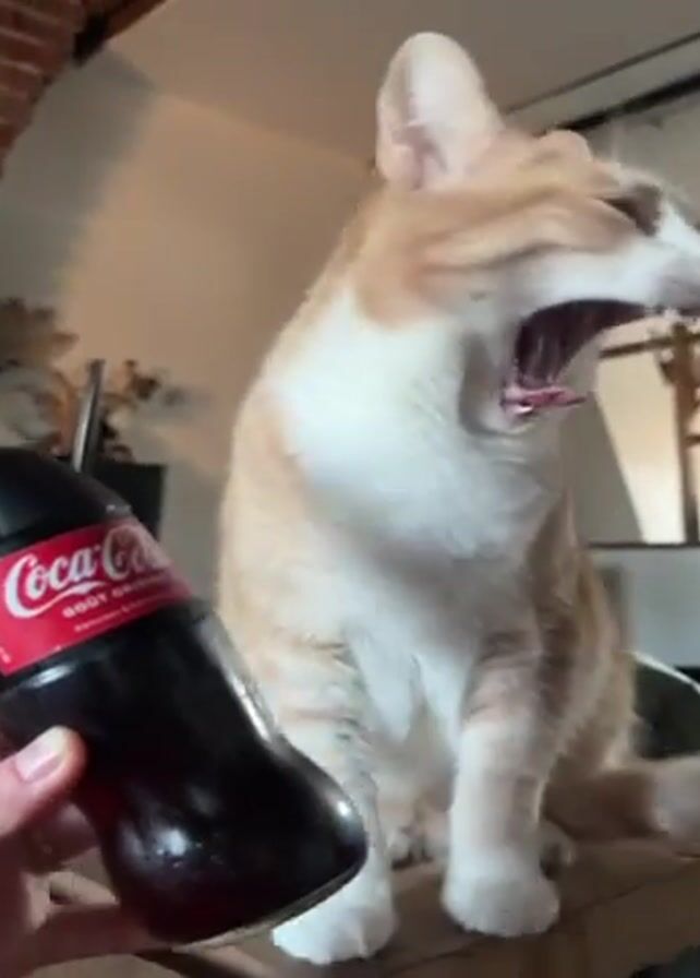 A person holds a glass bottle of Coca-Cola while an orange tabby cat sits on a surface next to it. The cat opens its mouth in a wide yawn, then licks its nose and appears to sniff at the bottle before turning its head away. The video is shot indoors, with exposed brick visible in the background.