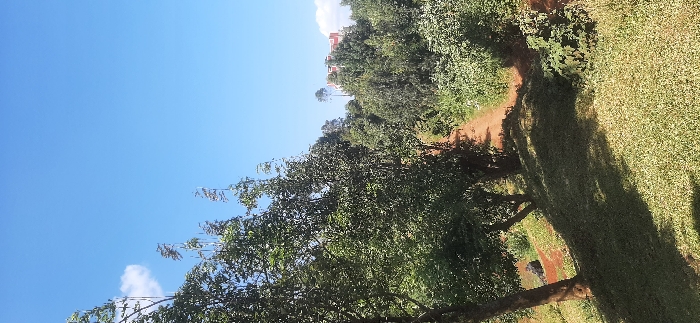 A scenic view features a clear blue sky. A building appears atop dense greenery. A narrow dirt path winds through thick foliage on the left. The right side boasts a sprawling grassy area with dappled sunlight filtering through trees, casting shadows on the lawn. Tall trees stand prominently in the foreground, their leaves lush and green.