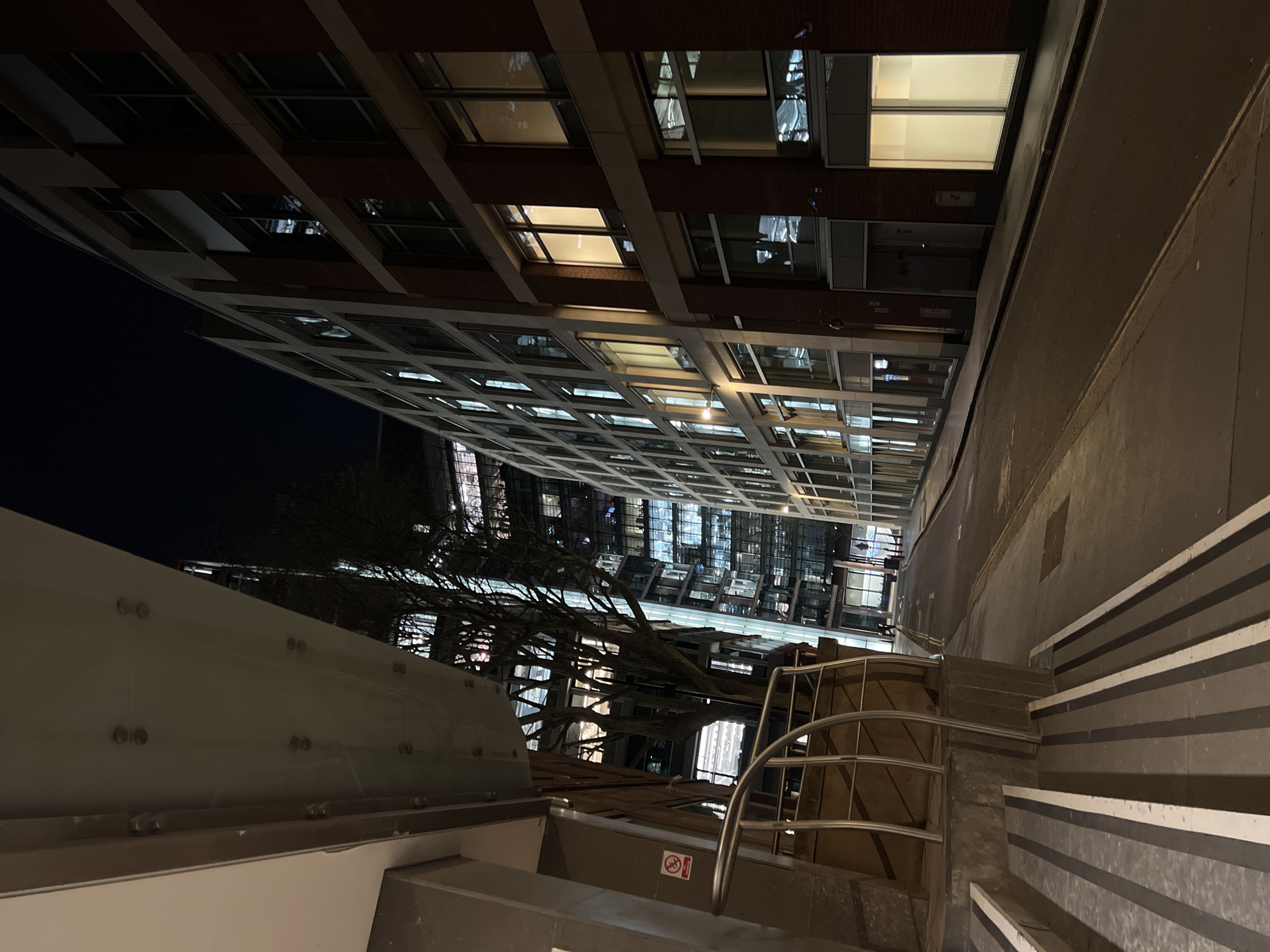 The image depicts a nighttime urban scene in London, United Kingdom, oriented with the horizon line running vertically. A tall building with a grid-like facade of windows, many illuminated, rises on the left. Adjacent to it is a red brick building with fewer windows, also lit. Below, a tree with bare branches obscures parts of the building. To the right, a narrow street runs away from the viewer. In the foreground are a set of stairs with striped edges and a silver handrail. A gray wall with a "No Smoking" sign is visible near the bottom. No people are visible in the scene.