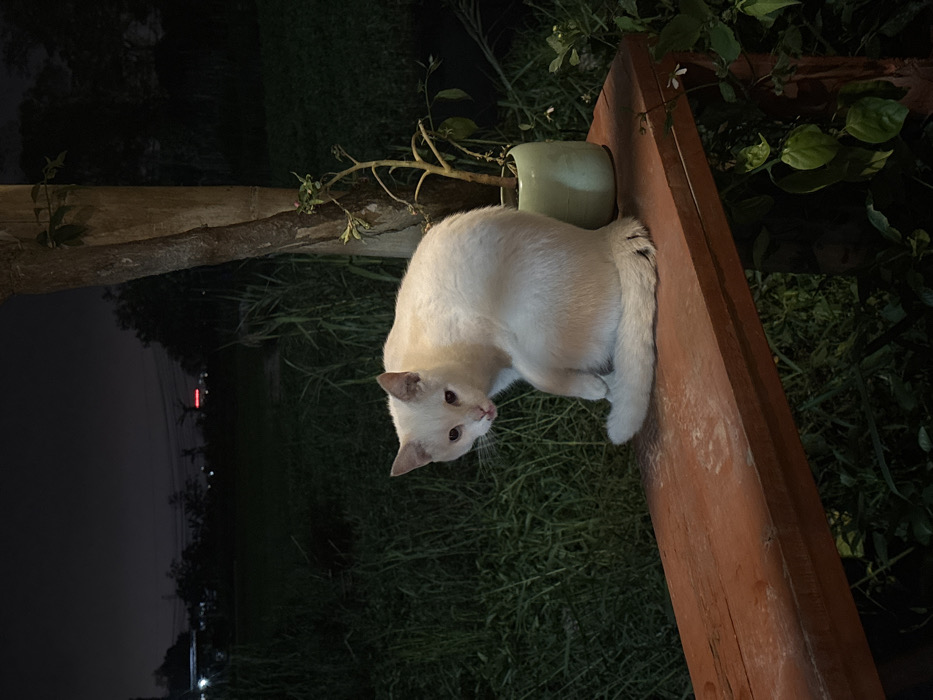 This image depicts a nighttime scene in Nam Hoa Lư Ward, Vietnam. A white domestic cat with light-colored eyes and a partially extended tongue is seated on a rustic, reddish-brown wooden bench in the lower left quadrant of the frame, facing the viewer with its body slightly angled to the left. To the right of the cat, on the same bench, rests a small, light green ceramic pot containing a sparse, short plant. A vertical wooden post or tree trunk stands directly behind the potted plant and extends upwards along the right side of the image. The immediate background features dense, dark green vegetation and tall grass. In the far background, under a dark night sky, faint artificial lights are visible, including a distinct horizontal red light structure on the left horizon and power lines overhead.