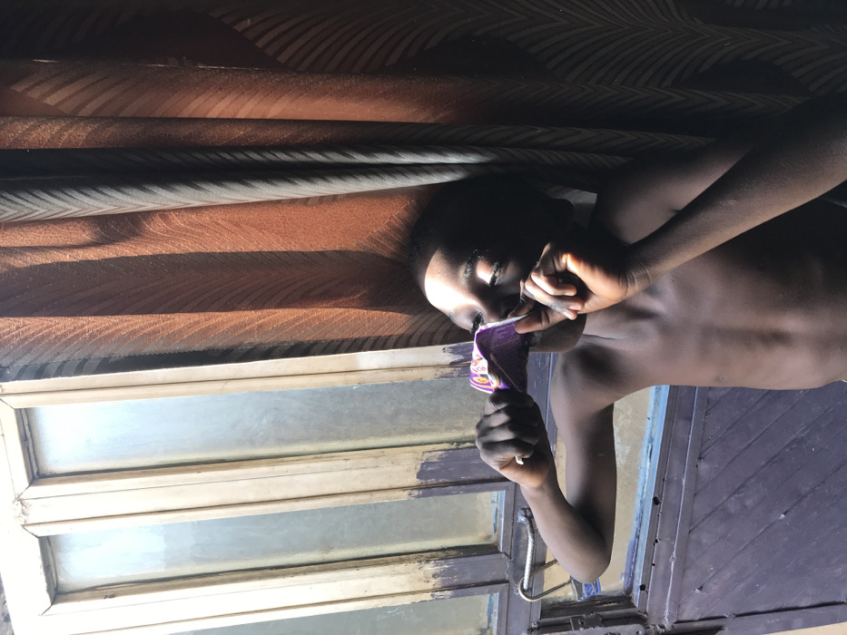 An individual, appearing to be a young, dark-skinned boy, is positioned in what appears to be an interior or sheltered exterior space