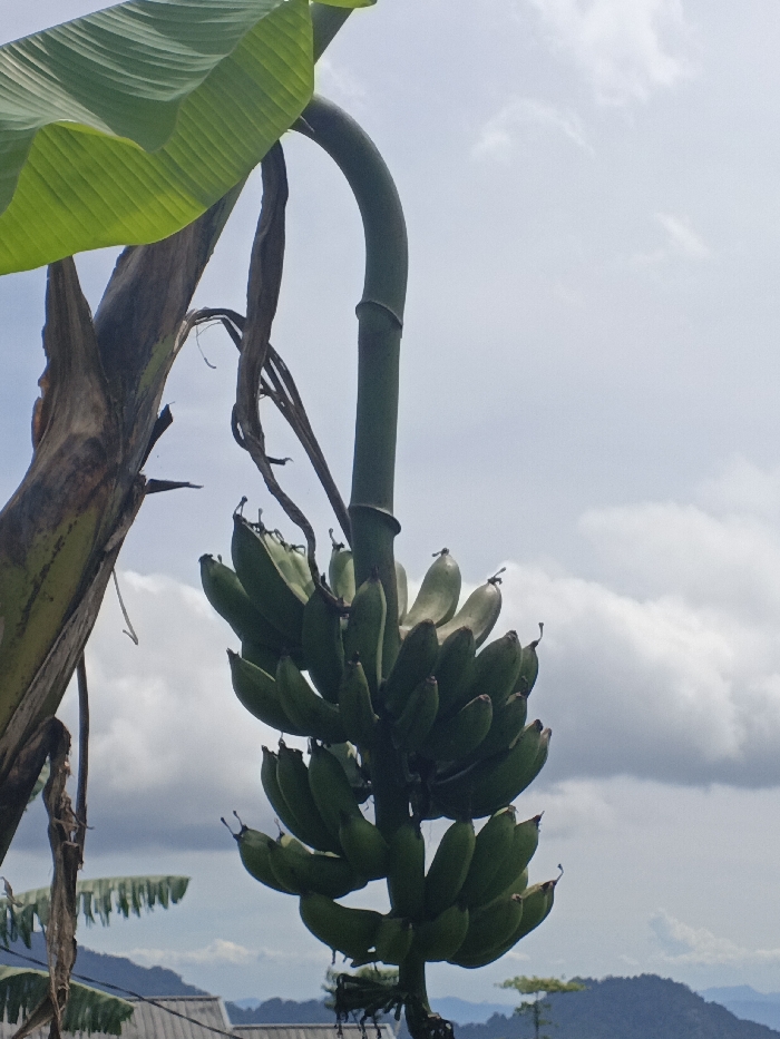 The scene, located in ឃុំ ផាត់សណ្ដាយ, Cambodia, depicts a close-up view of a large bunch of numerous green, unripe bananas hanging from a banana plant. The bananas are clustered in multiple hands, exhibiting a uniform green color indicative of immaturity. To the left, a portion of the banana tree's robust, textured, brownish-green pseudostem is visible, accompanied by dried, fibrous plant material. A large, vibrant green banana leaf extends from the top left corner of the frame. A slender, dark green, segmented bamboo pole is utilized to provide support, propping up the main stem of the banana bunch, causing the stem to form a distinct U-shaped curve. The background features an overcast sky with scattered white and grey clouds. In the lower mid-ground, sections of pale rooftops or structural elements are partially discernible. Further in the distance, hazy blue mountain ranges span the horizon under a light, cloudy sky.