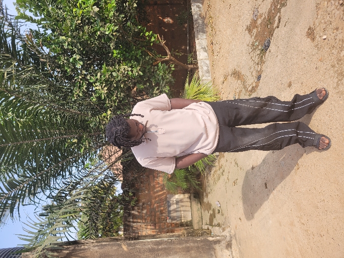 The scene depicts a male individual standing outdoors in Makurdi, Nigeria. He is observed with dark skin and dreadlocks, wearing a light-colored, short-sleeved collared shirt, dark baggy pants with white vertical stripes along the sides, and dark sandals. His head is bowed, directed towards the ground, and both hands are placed in his pants pockets. The ground is unpaved, consisting of light brown packed earth, exhibiting scattered darker, moist patches and minor debris. The background features dense green foliage from various trees and shrubs, including palm fronds. A weathered concrete column is visible on the far left, and a reddish-brown perimeter wall is partially discernible behind the vegetation. The sky is clear blue, indicating daylight conditions, with strong illumination casting a distinct shadow of the individual onto the ground.