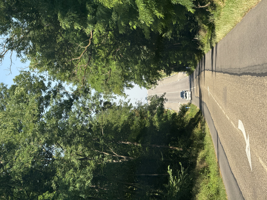 A car drives on a straight road. The road is surrounded by trees, creating a tunnel effect. A large white arrow is painted on the right side of the road, pointing towards the left. The road is made of asphalt, and the trees are lush green. The sky is visible in the distance.