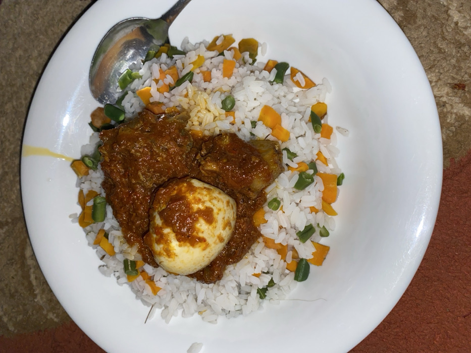 A white, oval-shaped ceramic plate, observed in Sabon Tasha, Nigeria, contains a prepared meal. The plate holds white rice interspersed with diced orange carrots and green beans. Centrally positioned on the rice is a serving of reddish-orange stew, containing multiple pieces of meat and one whole, peeled hard-boiled egg covered in the same stew. A silver-colored spoon rests partially on the right side of the rice. A thin, dark fiber is present on the lower left portion of the rice. A light yellow drip mark is visible on the upper left rim of the plate. The plate rests on a textured surface, primarily brown and orange in color.