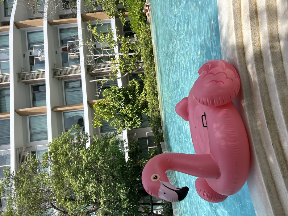 The image depicts an outdoor swimming pool scene in Wichit, Thailand, under bright daylight. A large pink inflatable flamingo float occupies the immediate foreground, resting on light-colored concrete steps that lead into the clear blue water. The flamingo features a black beak, yellow eyes, and a black handle on its back. In the mid-ground, a person is partially submerged in the pool water, with their back facing the camera, appearing to be at rest. The pool area is bordered by lush green tropical foliage, including trees and dense bushes. In the background, a multi-story modern building, presumably a hotel or resort, features numerous balconies with glass railings and large windows, indicating a residential or guest accommodation structure.
