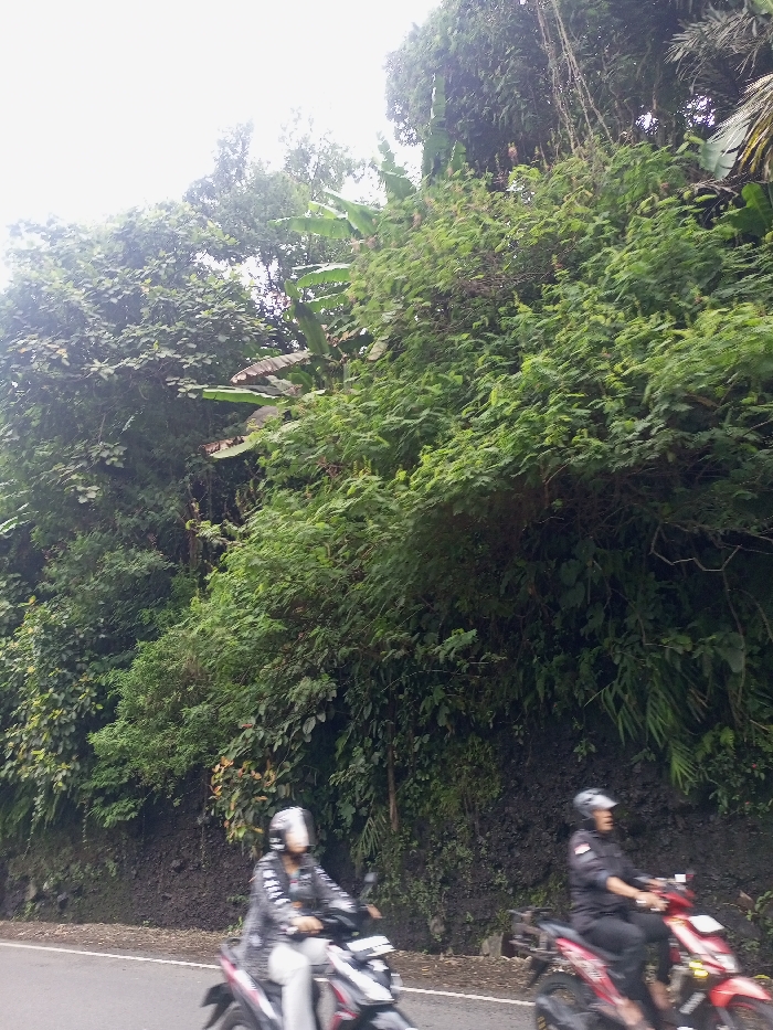 A roadside scene showcases lush green vegetation growing on the slope. Two motorcyclists, wearing helmets, are riding on the asphalt road along the vegetation-covered hillside. The foliage consists of various trees and plants, including banana trees. The sky above is overcast, casting diffused light over the environment.