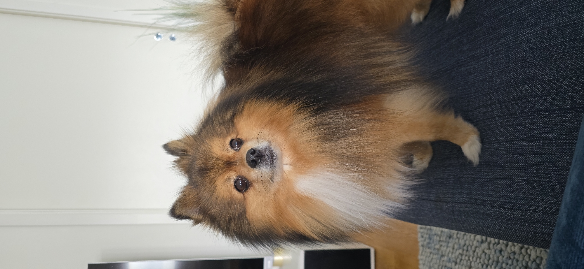 A fluffy, multi-colored Pomeranian-type dog occupies the central and right portions of the frame, facing slightly right but looking directly at the camera. The dog exhibits a coat of predominantly reddish-brown and orange fur, with darker black tips on its back and ears, and a prominent white chest and white paws. Its tail is curled over its back, partially visible on the right. The dog is positioned on what appears to be a person's lap or legs, covered in dark blue, textured fabric. In the background on the left, a portion of a dark television screen on a white stand is visible against a light-colored wall with vertical molding. On the right background, a plain light-colored wall features a decorative element consisting of two clear, spherical ornaments and some light green, spiky foliage. The foreground to the far left shows a segment of a blue-grey textured rug. The indoor environment is brightly lit. There are no visual elements within the image to specify a location in the city of Bergen, Norway.