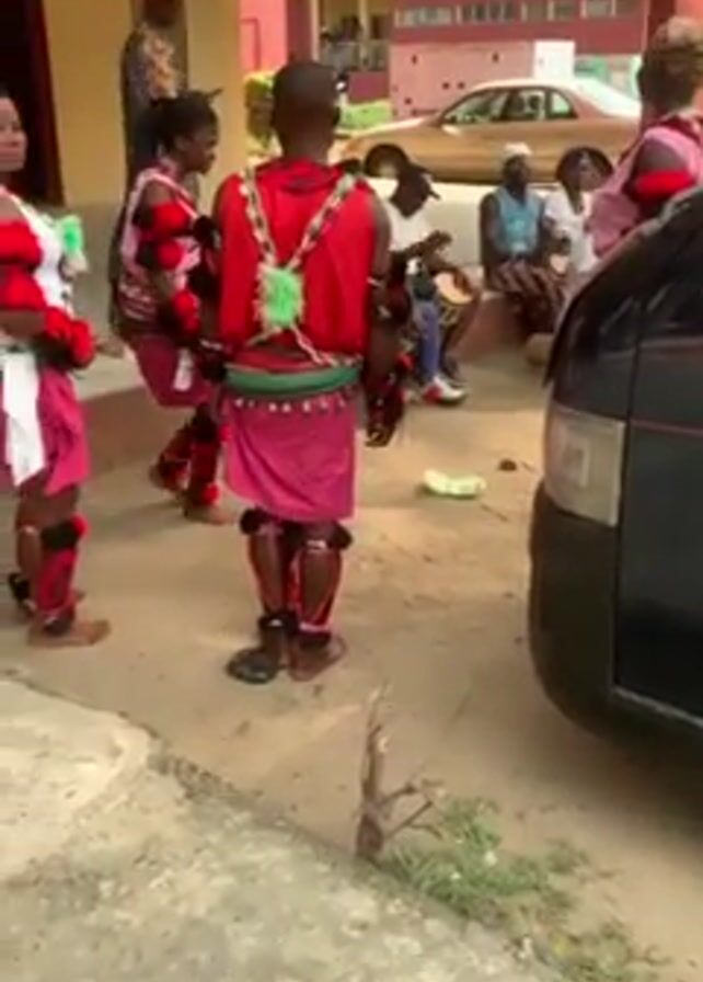 group of dancers performing outside a building. The dancers are wearing traditional outfits featuring red, pink, and white colors with fringe and ornaments. They are barefoot and appear to be moving to the beat of a drum played by a seated musician in the background. Several other people are watching the performance. A dark-colored van is parked nearby. The setting seems to be a paved outdoor area near a building with a covered walkway.