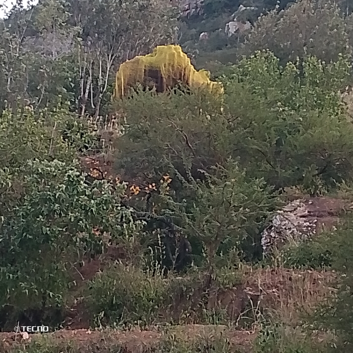 A lush, green landscape fills the frame, dominated by various trees and foliage. A structure covered in yellow netting rests on a slope, almost hidden among the dense vegetation. Rocky outcrops and a visible hillside add depth to the scene, while the terrain appears uneven and natural. The overall impression is that of a wild, undisturbed environment.