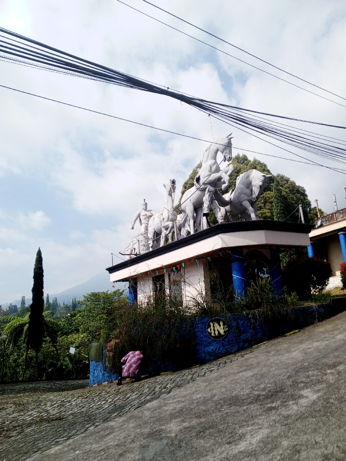 This image captures a daylight scene in Multhan, India, from a low-angle perspective looking uphill. The central focus is a white, single-story building topped with a large, elaborate white sculpture group. The sculpture depicts a chariot, seemingly pulled by at least four horses, with one rearing dynamically. A human charioteer figure is visible within the chariot, accompanied by other human figures and what appear to be smaller animals. The building itself features a white exterior, supported by prominent blue columns, and has a blue-painted lower section or retaining wall. Small, multi-colored triangular pennants are strung along the edge of the roof. A circular "IN" logo, yellow on a black background, is affixed to the blue wall on the lower right side. In the lower left quadrant, a person wearing a purple and white patterned garment is partially visible, stooping or kneeling adjacent to the blue wall, partially obscured by green foliage. The immediate foreground consists of a dark gray paved surface, likely a road or path, sloping upwards towards the right. The background features a dense, green, tree-covered mountainous or hilly landscape under a partially cloudy sky. A tall, slender, dark green coniferous tree stands prominently on the far left. Numerous black electrical or communication cables are stretched across the upper portion of the frame against the sky. The scene is brightly illuminated by natural sunlight.