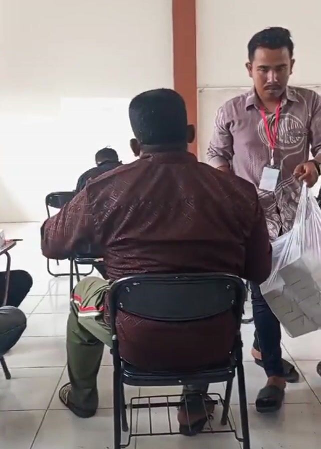 room with several people seated in chairs facing the front where there is a projection screen. A man wearing a patterned shirt and a lanyard is walking between the rows of seated people, holding a clear plastic bag with white contents inside. The room has white walls with a brown accent stripe near the top. The floor is tiled. There is a door visible in the background.