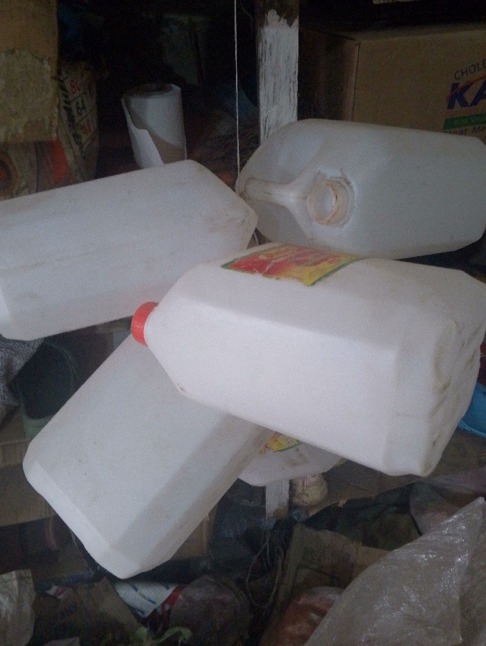The image depicts a cluttered indoor storage area within Kinale ward, Kenya. Multiple white, rectangular plastic jerrycans or containers are prominently displayed, stacked or positioned haphazardly. One jerrycan in the upper right is lying on its side with its cap removed, revealing a circular opening and an integrated handle. Another jerrycan in the center foreground features a red cap and a partially visible yellow and red label. The background is dimly lit and contains various indistinct objects, including cardboard boxes; one box displays partial text "CHOLE..." and "KA". A white-painted wooden post or beam is visible vertically on the right side. No individuals are present, and no actions or interactions are occurring.