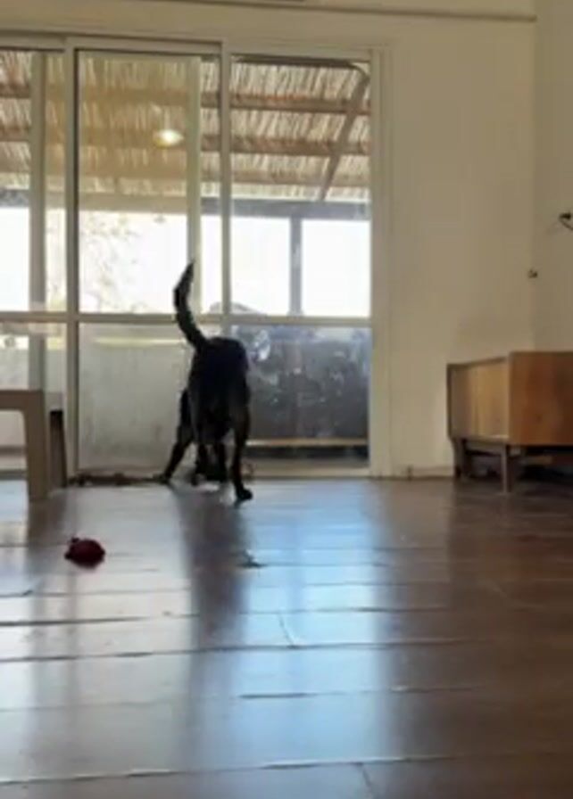 A black dog is indoors in a room with light brown wooden floors. The room is sparsely furnished. The dog approaches a large glass sliding door leading to an outdoor area and picks up a white object, then carries it away. There is a red toy on the floor. Above the door is an air conditioning unit. The room is well lit, presumably with daylight.
