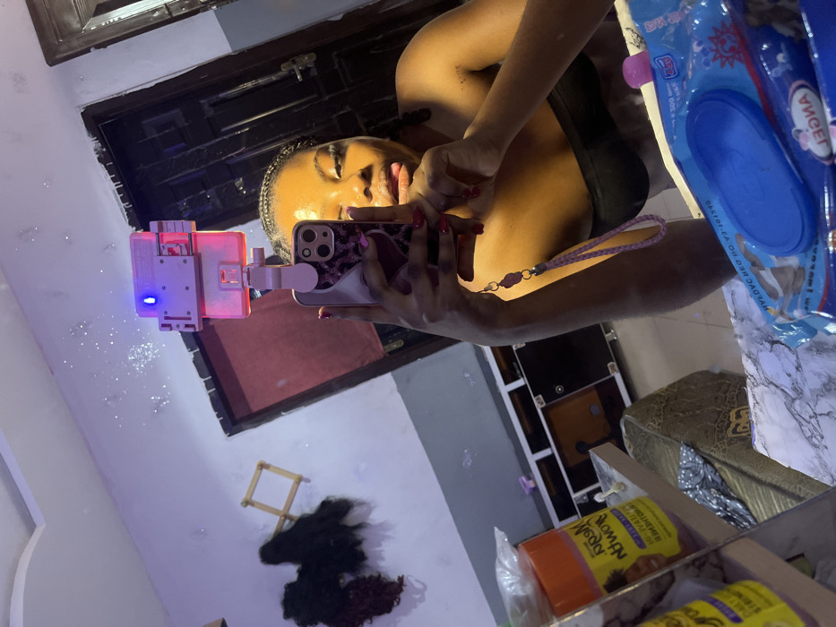 The image displays an indoor mirror selfie taken in Gbongan, Nigeria. A young woman, visible from the chest up, is reflected in a mirror. She has dark braided hair, wears makeup, and is dressed in a dark strapless top. Her right hand, with red manicured fingernails, holds an iPhone-like smartphone in a purple and pink leopard print case. A pink, clip-on ring light with a glowing blue indicator is attached to the top of the phone, and a pink braided wrist strap hangs from the device. The woman's head is slightly tilted, and her tongue is partially extended. The foreground surface, exhibiting a white marble-like pattern, holds several items. On the left, an orange bottle with a yellow label, partially readable as "Mega Growth," is present. To the right, a blue package of "Angel" brand wet wipes with a blue flip-top lid is visible. The reflected background reveals a room with light-colored walls, appearing pinkish-purple due to lighting. On the left wall, several dark hair extensions hang, alongside a light-colored wooden drying rack. Below these, a dark wooden cabinet or dresser with multiple compartments is situated. A dark wooden door with a metallic handle is reflected on the right side. The ceiling is white with decorative molding, and scattered bright points of light or glitter are visible on the upper reflected wall.
