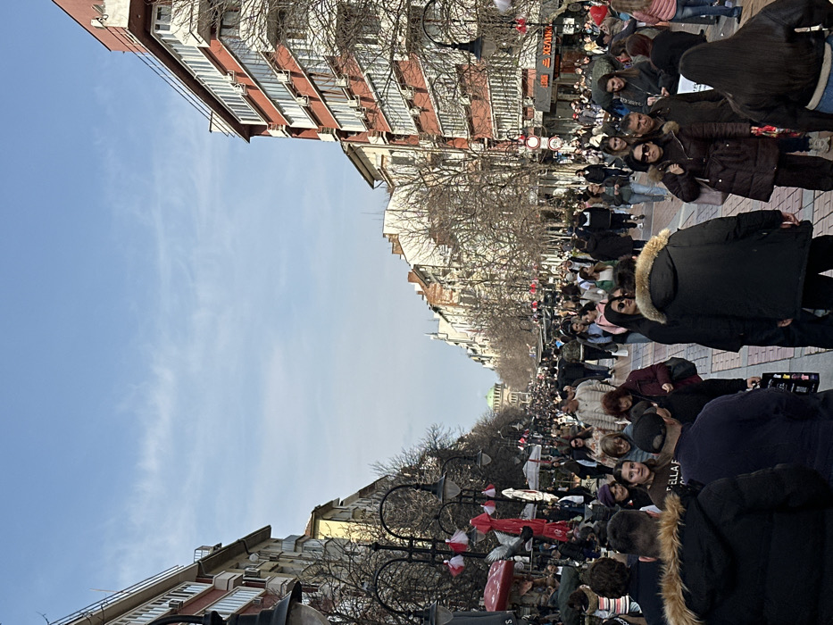 The image displays a bustling Vitosha Boulevard, a pedestrian street in Sofia, Bulgaria, looking north towards the St. Nedelya Church, whose green dome is visible in the distant center. The sky is bright blue with minimal, wispy clouds. The boulevard is densely populated with a large crowd of individuals of varying ages, walking in both directions. Most people are dressed in heavy winter or early spring clothing, including coats and jackets, some with fur-lined hoods. Buildings of multiple stories line both sides of the street. On the right, a prominent building features a reddish-brown facade with numerous white-framed windows, balconies, and external air conditioning units. Buildings on the left exhibit lighter, cream-colored facades. Bare deciduous trees are visible along the street, indicating a season outside of full foliage. Ornate black streetlights with multiple lanterns are positioned along the boulevard, primarily on the left side. Temporary outdoor market stalls or structures with red and white decorative elements are visible among the pedestrians on the left. The ground is paved with light-colored, possibly brick, material. Shopfronts are present at ground level on both sides of the street, with some Cyrillic signage partially visible on the right. The scene captures a typical daytime urban environment with high foot traffic.